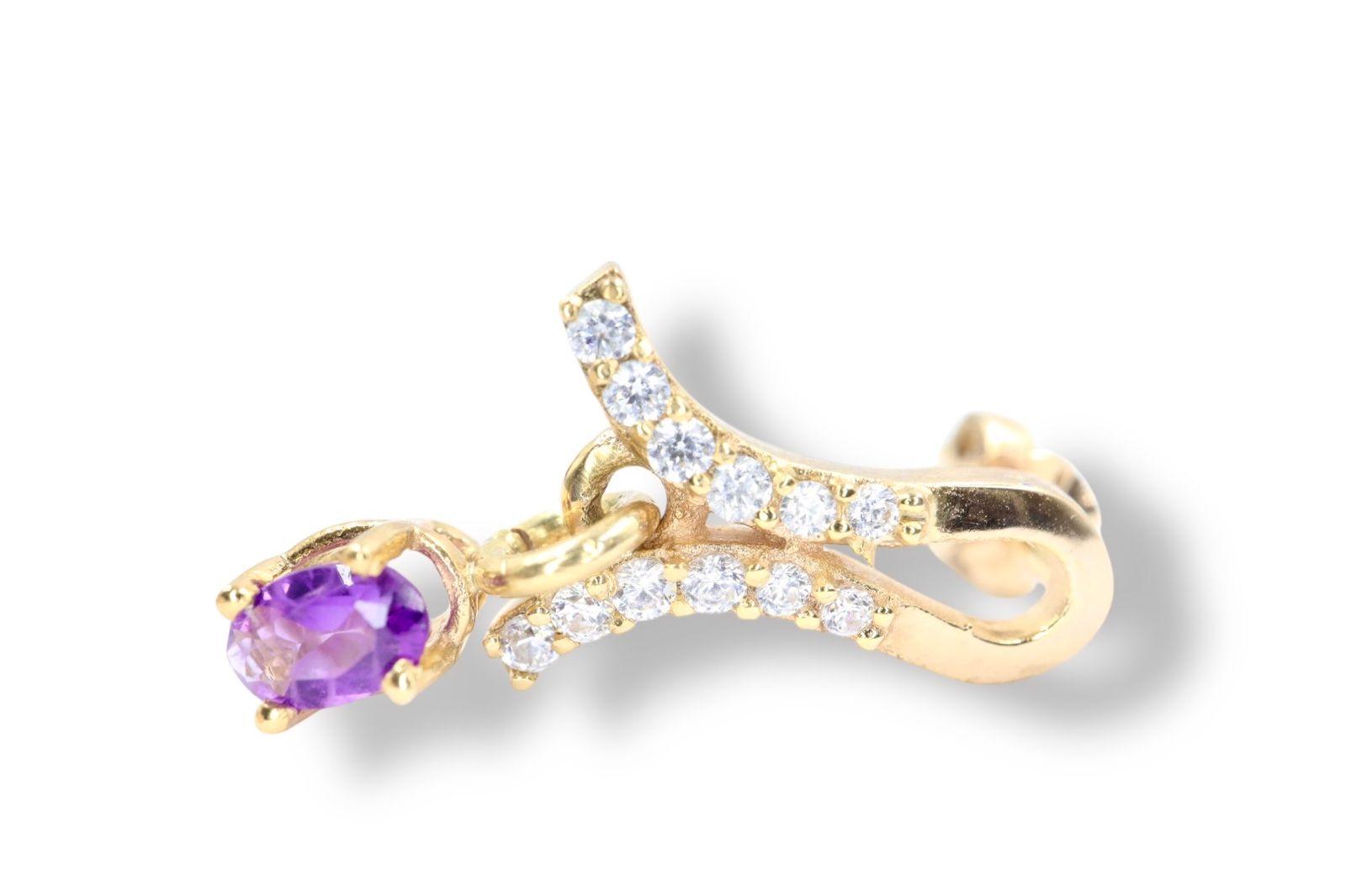 En el coraz贸n de cada arco, una amatista ovalada de 4x3 mm, con su profundo color p煤rpura, irradia una sabidur铆a y una calma que evocan la realeza y la serenidad de una noche estrellada. La amatista est谩 rodeada por un deslumbrante halo de doce diamantes de 1 mm a cada lado, un total de veinticuatro, que forman un arco de luz pura y brillante. El contraste entre la vibrante p煤rpura de la amatista y el resplandor de los diamantes crea una armon铆a visual que es a la vez cautivadora y sofisticada.