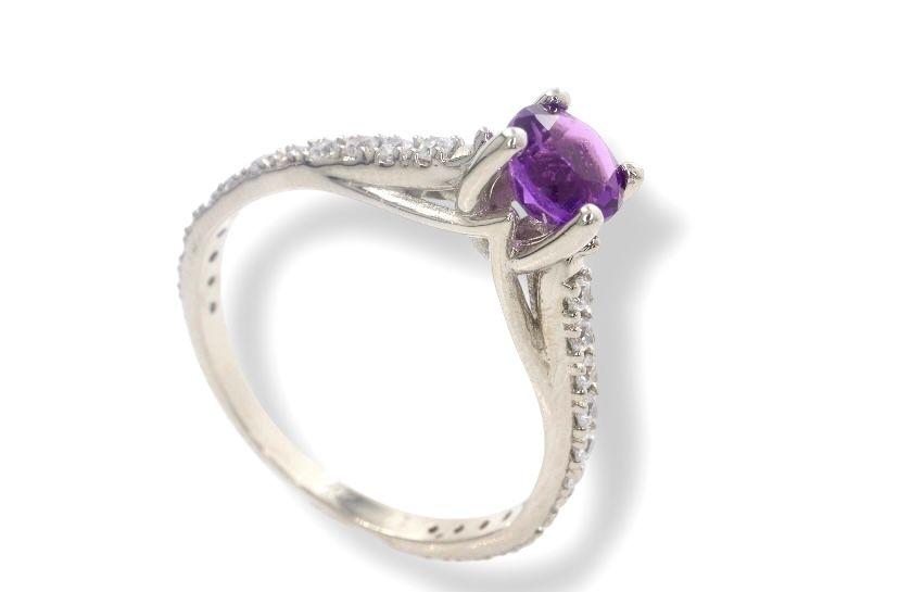 El protagonismo de la amatista central se realza con un halo de pequeños diamantes que la rodean, creando un efecto de brillo intenso y magnificencia. Los sutiles detalles del engaste y la forma de la banda hacen de este anillo una joya sofisticada y moderna, ideal para celebrar un compromiso, un aniversario o cualquier momento especial.