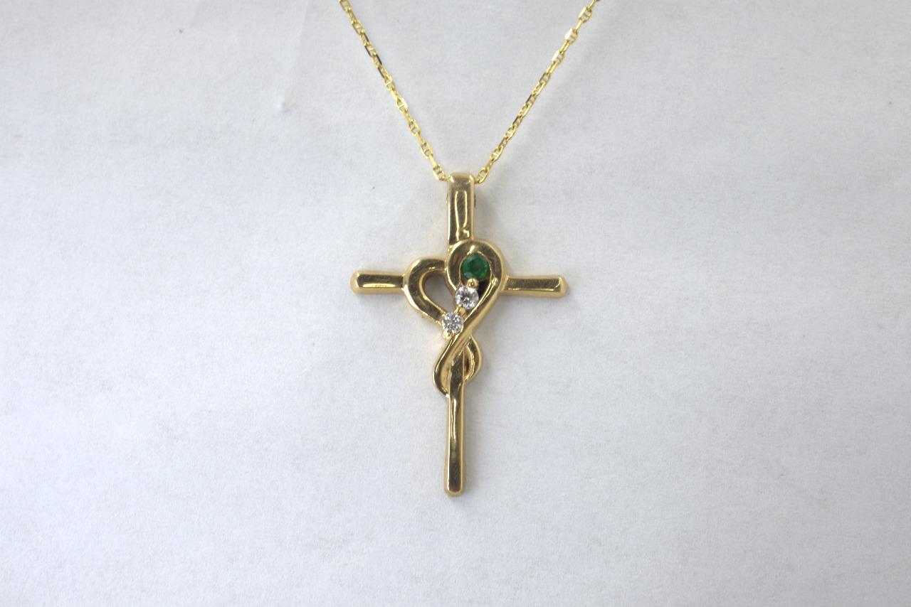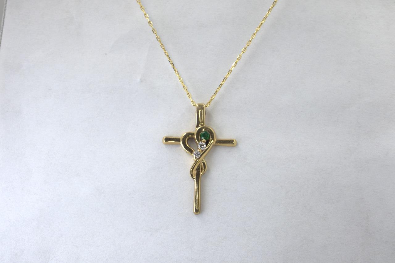 Dije de Cruz "Esperanza Eterna" en Oro Amarillo de 14K con Esmeralda y Diamantes - 14K Oro Amarillo, 1 Esmeralda de 3mm, 2 Diamantes de 2mm.