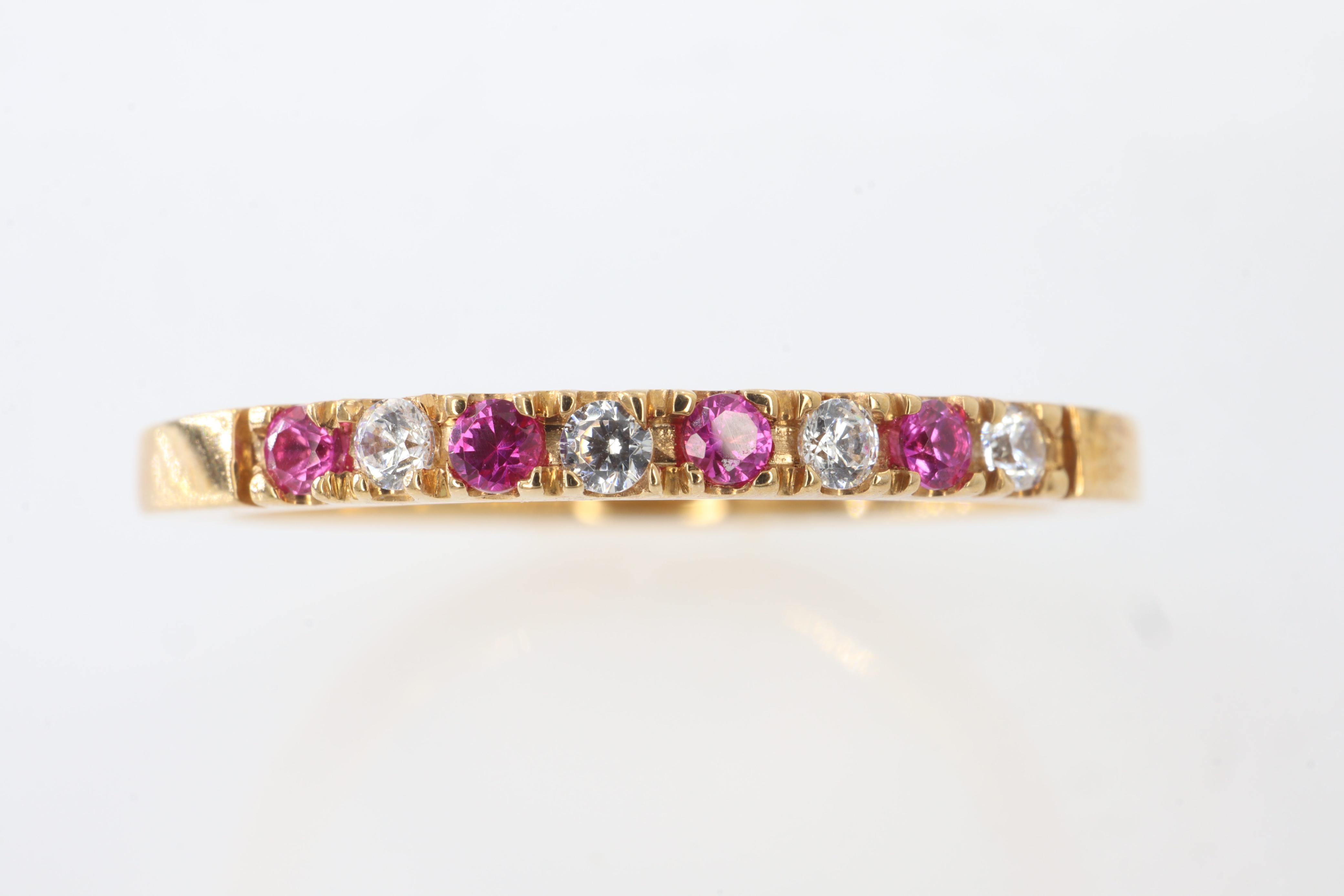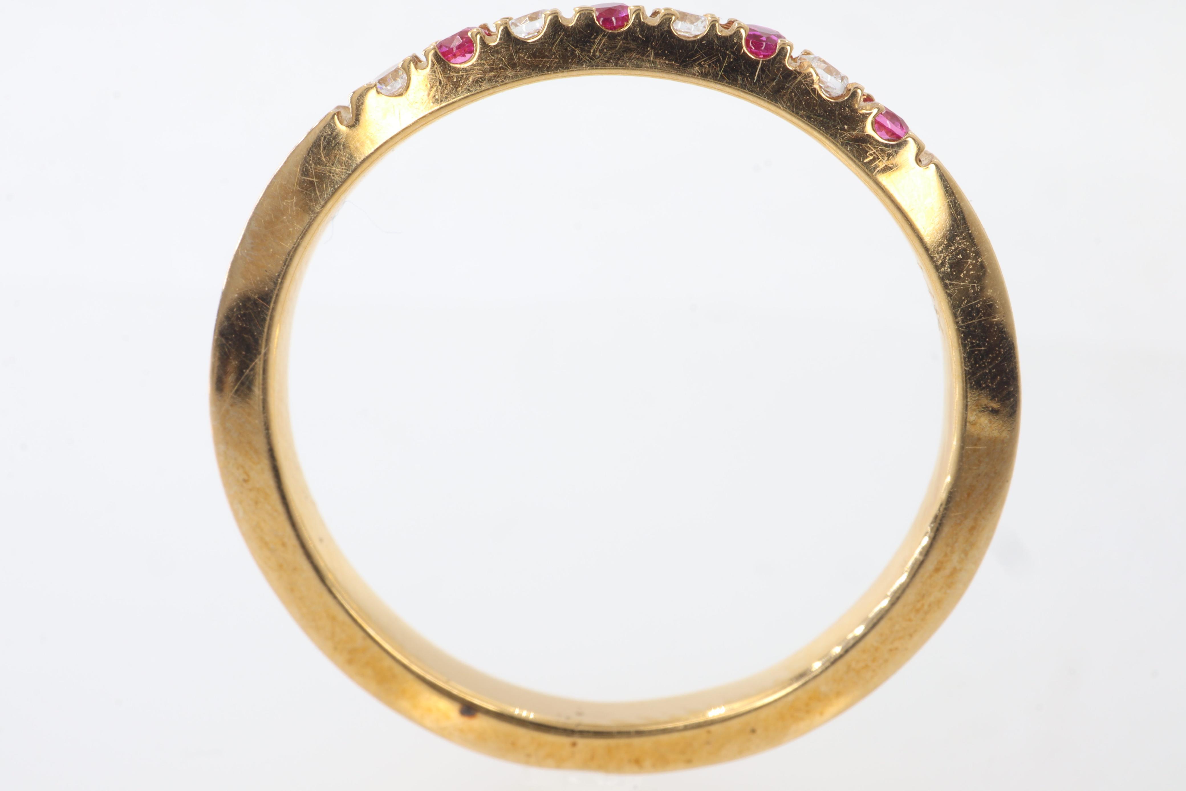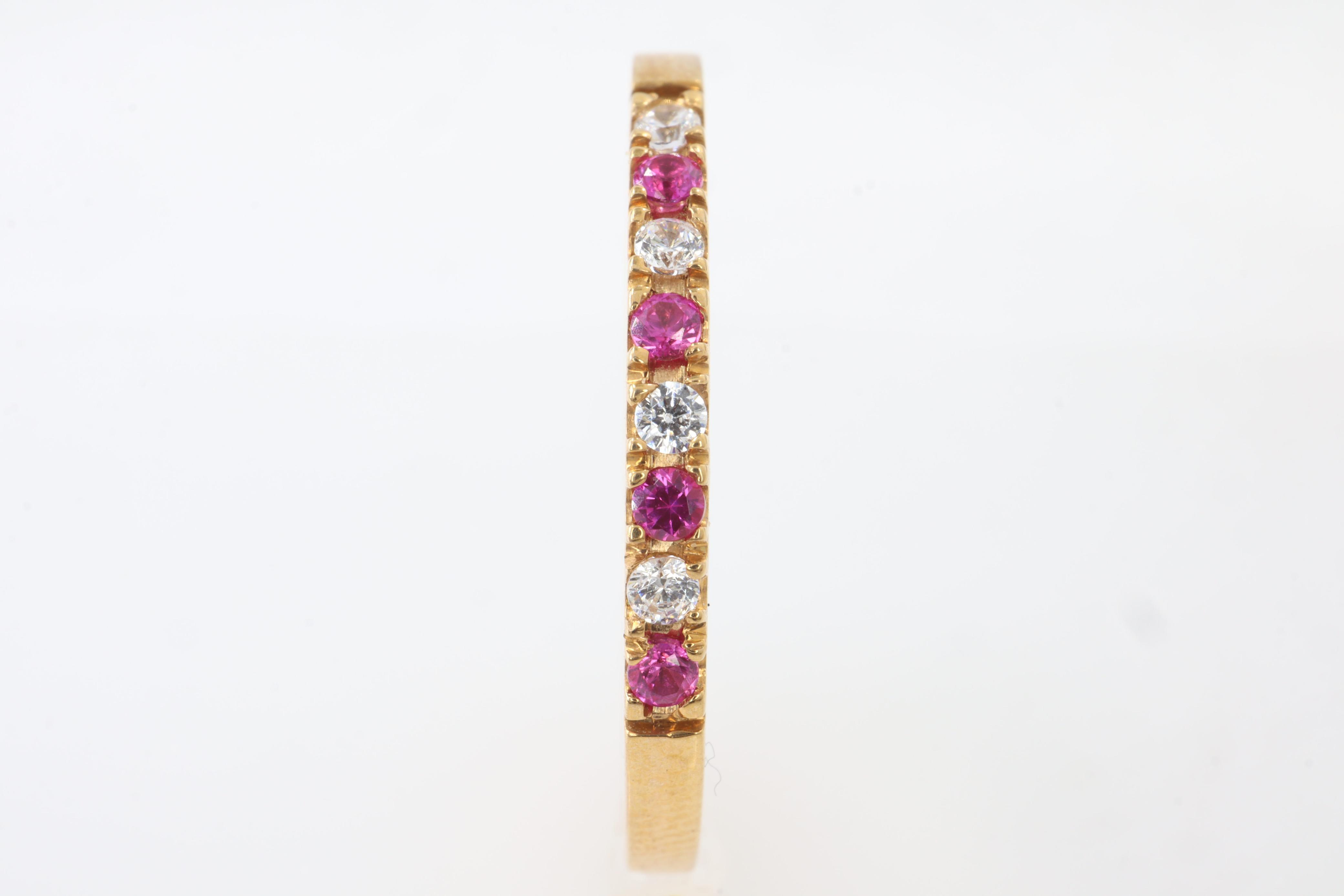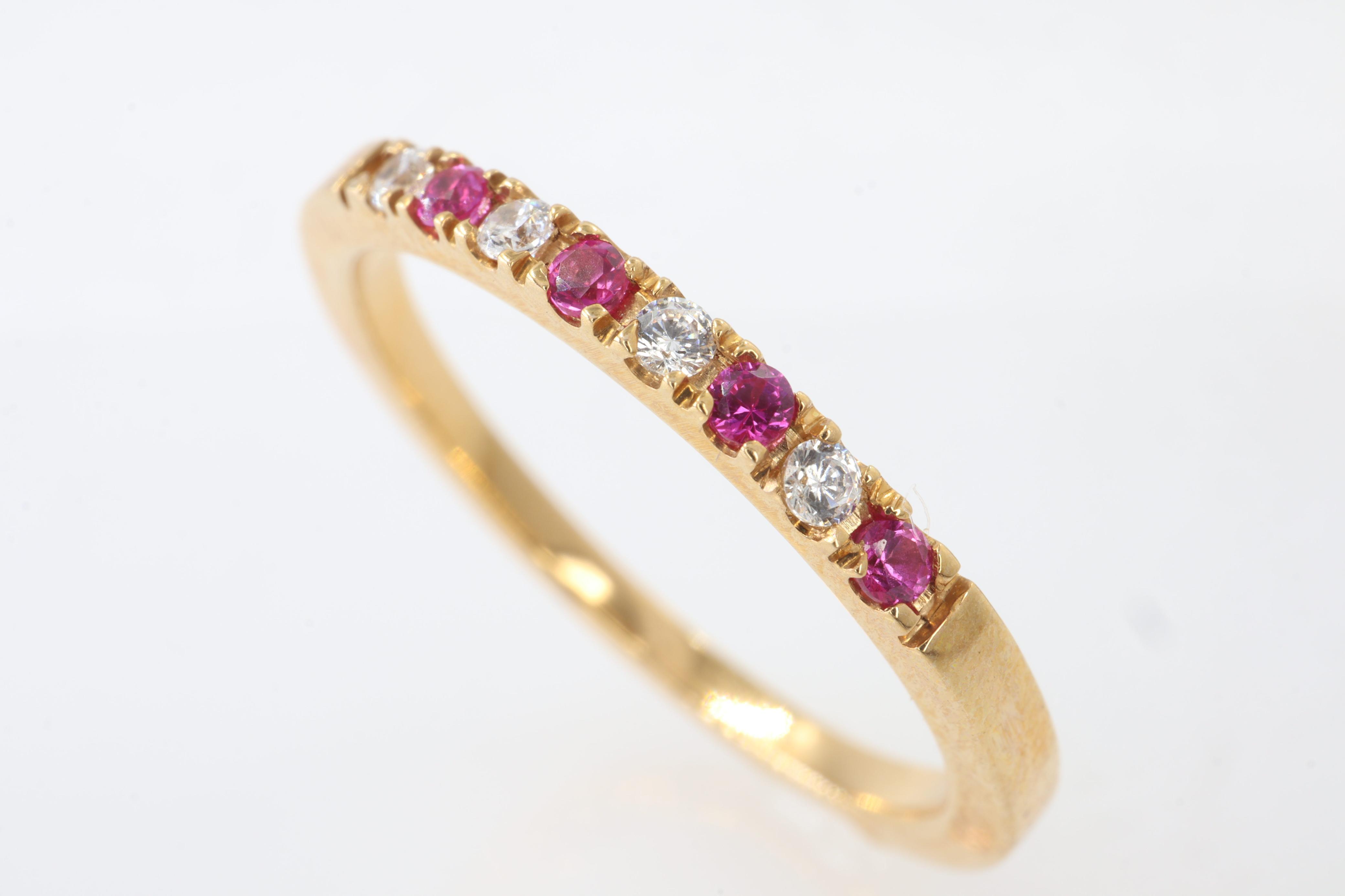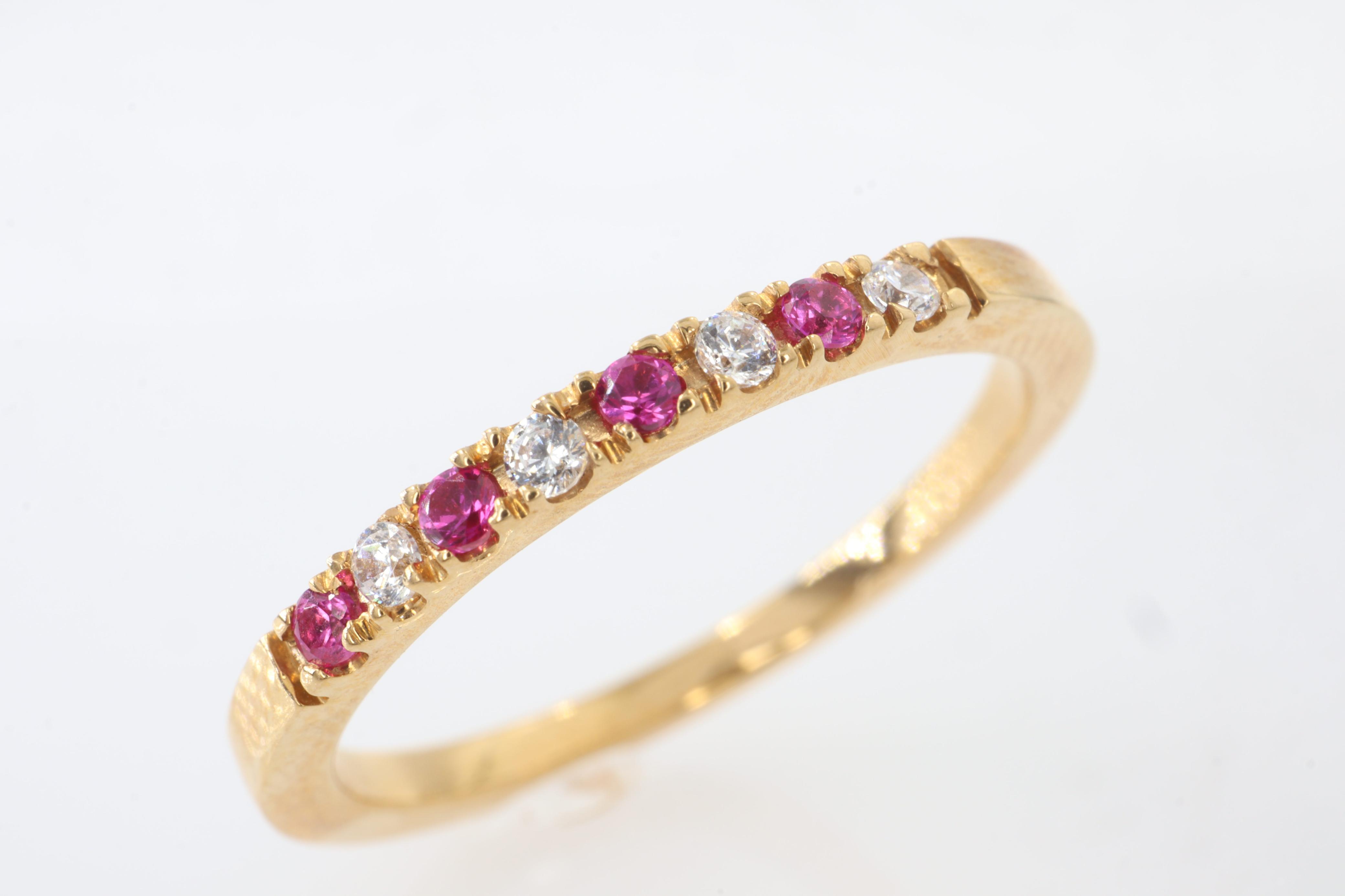 Anillos"Anillo ""Fuego y Brillo"" en Oro Amarillo de 14K con Rubíes y Diamantes. Este exquisito anillo es una celebración de la elegancia y el contraste. Elaborado con la calidez atemporal del oro amarillo de 14K, presenta un diseño de doble banda que entrelaza el fuego apasionado de los rubíes con el brillo eterno de los diamantes. Una hilera de intensos rubíes, cuidadosamente seleccionada por su vibrante color carmesí, se complementa a la perfección con una hilera de diamantes resplandecientes. Ambas gemas están engastadas de forma segura en un diseño de canal, lo que crea una superficie lisa y continua que maximiza su brillo y permite que la luz se refleje con cada movimiento. Este anillo es una declaración de sofisticación y buen gusto, ideal para conmemorar momentos especiales o simplemente para añadir un toque de lujo a tu estilo diario."