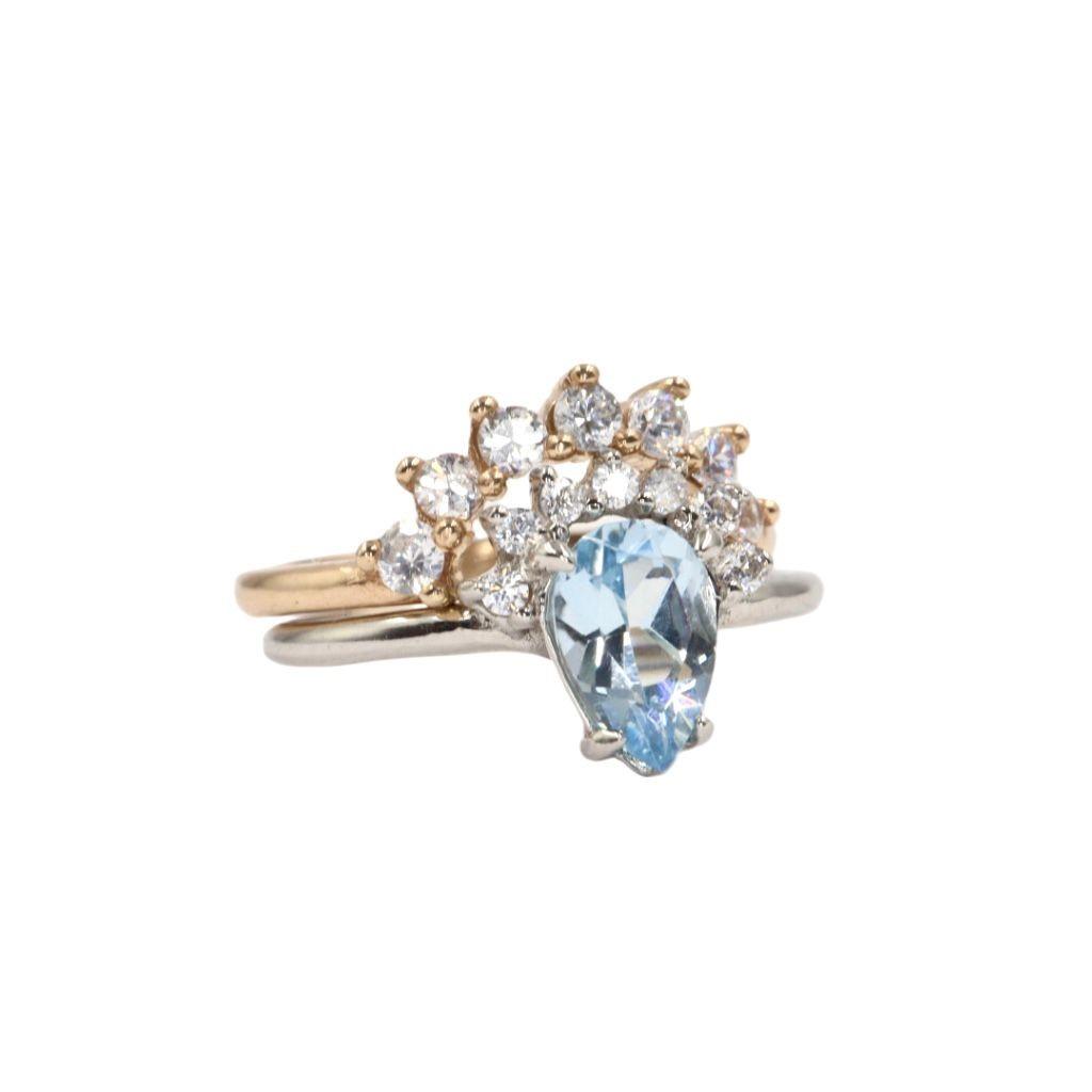 La pieza central es una exquisita aguamarina de talla gota, cuyo color azul translúcido y suave brilla con una pureza inigualable. Esta gema se encuentra delicadamente abrazada por una banda de doble vástago. Un lado de la banda se presenta con una superficie lisa y pulida, mientras que el otro está adornado con una hilera de 7 diamantes de 1 mm, que aportan un brillo deslumbrante y realzan la belleza de la aguamarina.