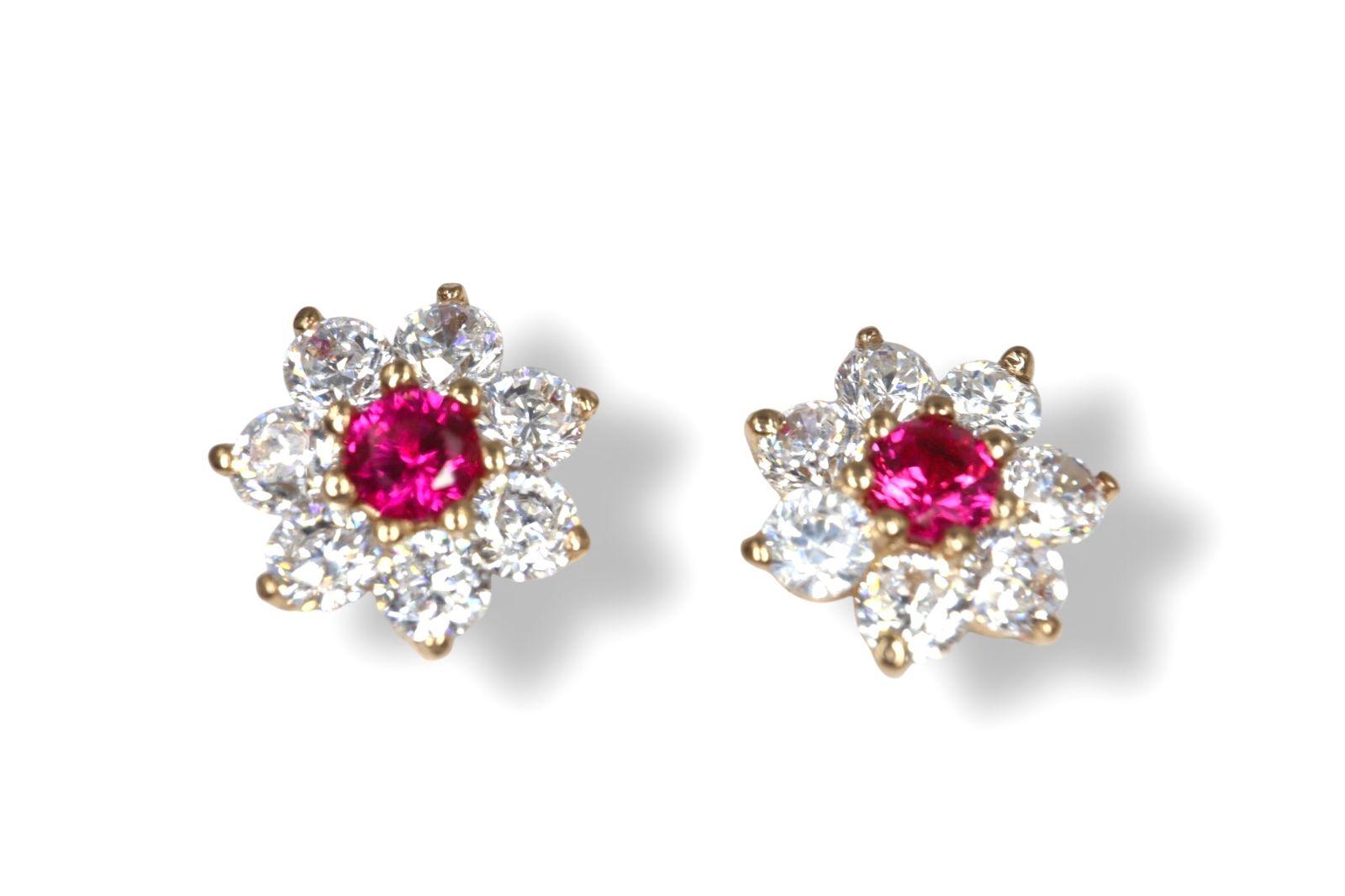 Aretes Broquel "Luz de la Promesa" en Oro Amarillo de 14K con Diamantes - 14K Oro Amarillo, 2 Rubí 3mm, 14 Diamantes 3mm