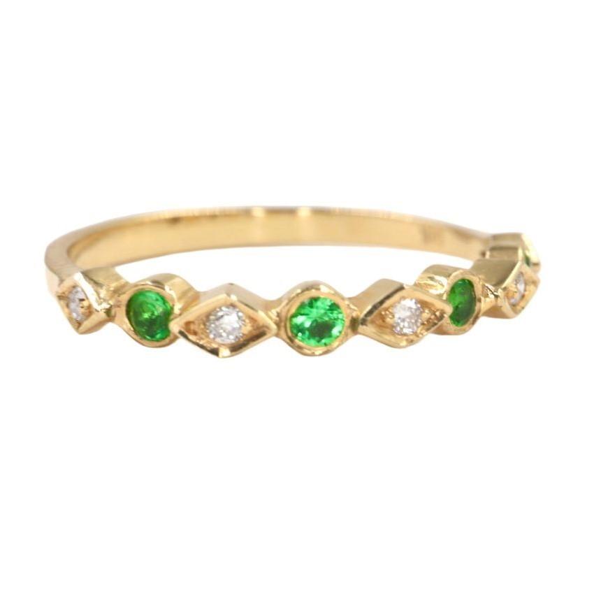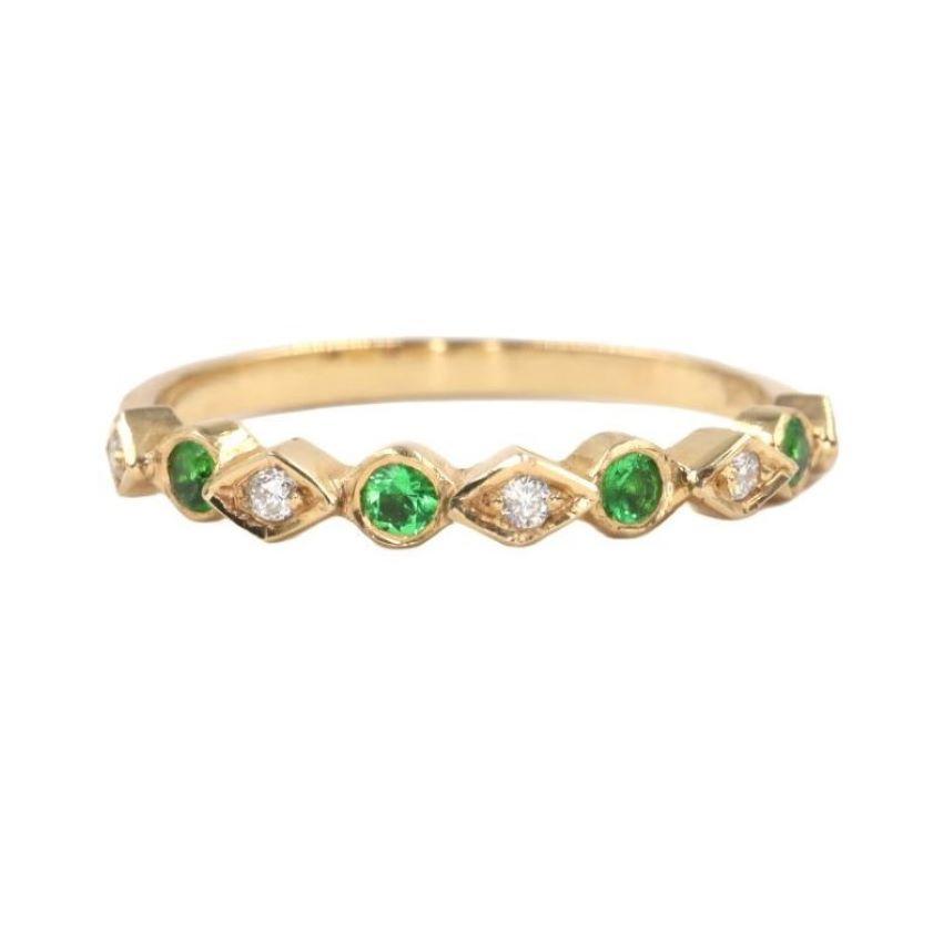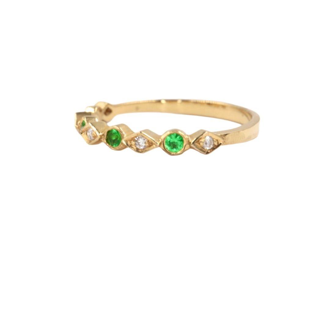La banda est谩 exquisitamente adornada con una hilera de gemas que alternan en un patr贸n armonioso. Cuatro esmeraldas de 2 mm, con su profundo y vibrante color verde, evocan la frescura de la naturaleza y simbolizan el renacimiento. Estas gemas son acompa帽adas por cinco Diamantes de 1 mm, que aportan un brillo deslumbrante y crean un contraste perfecto de luz y color.