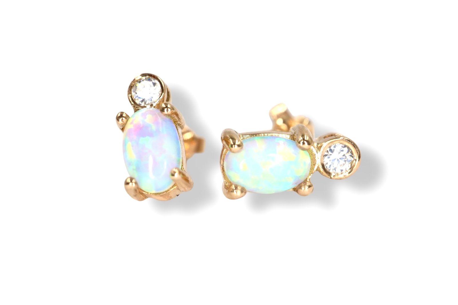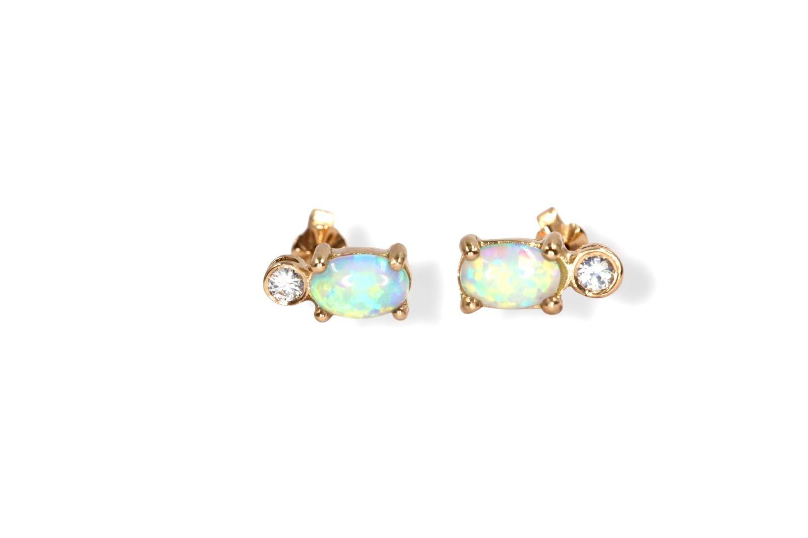 En el corazón de cada arete, un ópalo marfil ovalado de 4x6 mm irradia una luminiscencia suave y cambiante, como un secreto susurrado al oído. Sus tonos cremosos y sus destellos iridiscentes capturan la mirada con una belleza delicada y única. Sobre cada ópalo, un diamante de 2 mm centellea con una luz pura y brillante, como una estrella solitaria que guía la noche. El contraste entre el brillo sutil del ópalo y el destello claro del diamante crea una armonía visual que es a la vez encantadora y sofisticada.